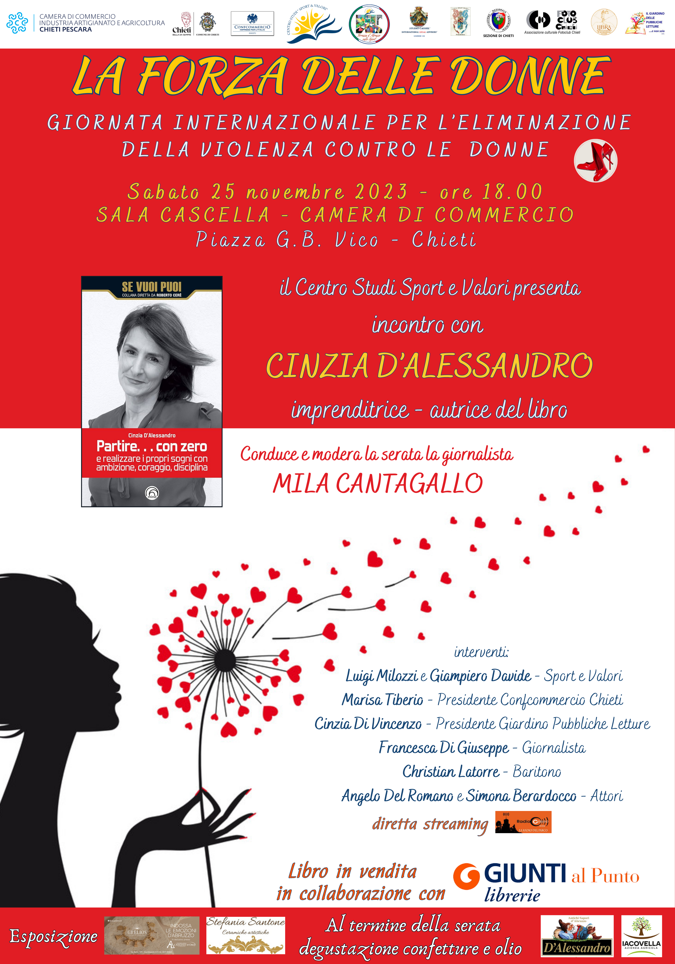 L’associazione Sport&Valori per le donne nella giornata internazionale per l’eliminazione della violenza contro le donne istituita dall’Assemblea Generale delle Nazioni Unite nel 1999.“La forza delle donne” è infatti il tema al centro dell’incontro in programma sabato 25 novembre 2023 alle ore 18 alla sala Cascella della Camera di Commercio di Chieti (piazza G.B. Vico).