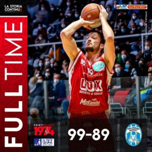 Missione compiuta. La difficile (e per nulla ) operazione salvezza è stata coronata questa sera sul parquet del Palatricalle “Sandro Leombroni”. La Lux Chieti Basket ha battuto Capo d’Orlando (99-89) ed ha conquistato la permanenza in A2 grazie alla contemporanea sconfitta casalinga  di Nardò contro Udine (91-100). Era la combinazione di risultati che doveva determinarsi perché la squadra di coach Calvani potesse festeggiare in anticipo (senza cioè aspettare i successivi impegni della fase ad orologio) la salvezza. Infatti, sommando i 2 punti di questa sera ai 6 che già vantavano i biancorossi nei confronti di Nardò al termine della stagione regolare (20 contro 14 nella classifica finale) il distacco sale ad 8 lunghezze, distanza incolmabile nelle tre gare che restano per concludere la fase ad orologio. La partita è stata sempre saldamente nelle mani di Meluzzi e compagni (54 a 37 all’intervallo lungo) ma la squadra siciliana ha lottato con grande e ammirevole impegno.