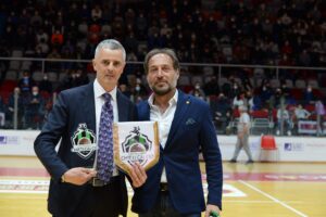 Prima del via il presidente del Comitato Centenario Chieti Calcio, Stefano Marchionno, per suggellare l’alleanza stretta con la Lux Chieti Basket ha consegnato una targa ricordo e il gagliardetto dei 100 anni neroverdi al presidente della società biancorossa, Gabriele Marchesani.