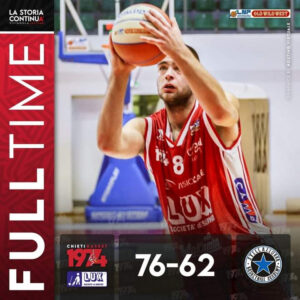 Non fallisce l’appuntamento con la vittoria la Lux Chieti Basket. Nell’ultimo dei tre recuperi che si erano accumulati i biancorossi di coach Maffezzoli battono al Palatricalle la Stella Azzurra Roma 76-62 (43-35 nell’half time).La partita è stata costantemente nelle mani della Lux che ha concluso in modo convincente un difficile ciclo di impegni. Importante il passo avanti compiuto in classifica. Domenica prossima in programma l’impegnativa trasferta a Chiusi. Infatti in un altro recupero della A/2 Girone Rosso il Chiusi questa sera ha vinto a Cento.