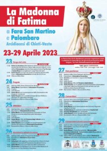 Arriverà in elicottero direttamente dal Santuario portoghese la Madonna di Fatima e starà con noi per un’intera settimana. Dal 23 al 26, a Fara S.Martino presso la Chiesa di San Remigio, dal 27 al 29 al Santuario dell’Assunta a Palombaro. Potranno essere organizzate visite e celebrazioni della Messa a richiesta delle parrochhie durante tutta la permanenza della Vergine.