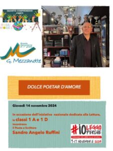 In occasione dell’iniziativa nazionale “ Io leggo perché”, organizzata ogni anno dall’Associazione Italiana Editori e resa possibile dal sostegno del Ministero della Cultura attraverso il Centro per il Libro e la Lettura in collaborazione con il Ministero dell’Istruzione e del Merito, le classi 1° A e 1° D della Scuola Media G. Mezzanotte di Chieti, Istituto Comprensivo n. 4, hanno incontrato il poeta-scrittore Sandro Angelo Ruffini. I ragazzi, preparati dalla docente Marilisa Palazzone, hanno rivolto delle domande riguardanti la vita e la produzione artistica dell’autore il quale, con grande maestria e altrettanto grande professionalità, ha catturato l’attenzione del giovane pubblico leggendo alcune poesie e alcuni racconti brevi scritti da lui nel corso del tempo, alcuni dei quali sono stati premiati. L’ospite, molto gradito, ha sottolineato l’importanza della lettura non solo perché apre la mente ma soprattutto perché “ rende liberi” e insegna a scrivere bene. Li ha dunque esortati a leggere il più possibile sia testi narrativi che poetici . “ Dolce poetar d’amore” è stato il tema dell’incontro: amore per la vita e per il prossimo . Tra i tanti brani che sono stati letti e spiegati ai ragazzi , il racconto di “ Paolino” è stato quello che ha commosso maggiormente i giovani uditori perché li ha fatti riflettere sul dramma della disabilità. Nel rispetto dell’iniziativa “ Io leggo perché”, lo scrittore ha infine regalato alla biblioteca scolastica un libro scritto da lui.
