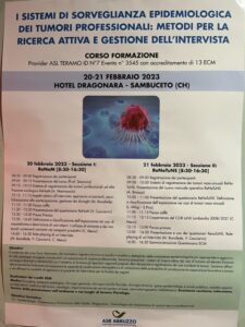 Lunedì 20 e martedì 21 febbraio 2023 si è svolto presso l’hotel Dragonara a San Giovanni Teatino, il corso di formazione ECM dal titolo “I sistemi di sorveglianza epidemiologica dei tumori professionali: metodi per la ricerca attiva e gestione dell’intervista” organizzato dall’Agenzia Sanitaria Regionale (ASR) Abruzzo. Il corso è legato all’attivazione della rete regionale per i registri dei tumori, che evidenzia una rilevante frazione di casi attribuibili all’esposizione a fattori cancerogeni nei luoghi di lavoro. In apertura del corso sono intervenuti: il Direttore dell’ASR Abruzzo, Pierluigi Cosenza, che ha sottolineato l’importanza dei registri di patologia quali strumenti per la valutazione, la sorveglianza, la prevenzione e la programmazione sanitaria, e il Responsabile scientifico del Centro Operativo Regionale (COR) del Registro Nazionale dei Mesoteliomi (ReNaM) e del Registro Nazionale dei Tumori Naso-Sinusali (ReNaTuNS) della regione Abruzzo, il professor Tommaso Staniscia, che ne ha illustrato i compiti e le modalità operative. Hanno partecipato al corso, in qualità di docenti, professionisti esperti del Dipartimento di Medicina, Epidemiologia, Igiene del lavoro e ambientale (Dimeila) dell’Inail e dei COR della Lombardia e della Toscana che hanno avuto il compito di fornire un quadro completo e aggiornato delle conoscenze epidemiologiche sui mesoteliomi e sui tumori maligni naso-sinusali prevalentemente attribuibili all’esposizione ad agenti cancerogeni nei luoghi di lavoro e di presentare i sistemi di ricerca attiva dei casi di tumore (ReNaM e ReNaTuNS) con l’obiettivo di formare gli operatori regionali preposti alla rilevazione e registrazione dei nuovi casi di malattia. Destinatari del corso sono stati i responsabili delle unità operative di anatomia patologica, chirurgia maxillo-facciale,chirurgia toracica, oncologia, otorinolaringoiatria, pneumologia e radioterapia e i referenti del Servizio di Prevenzione e Sicurezza sugli Ambienti di Lavoro (SPSAL) operanti nelle quattro ASL abruzzesi e che fanno parte della rete per la ricerca attiva dei casi.