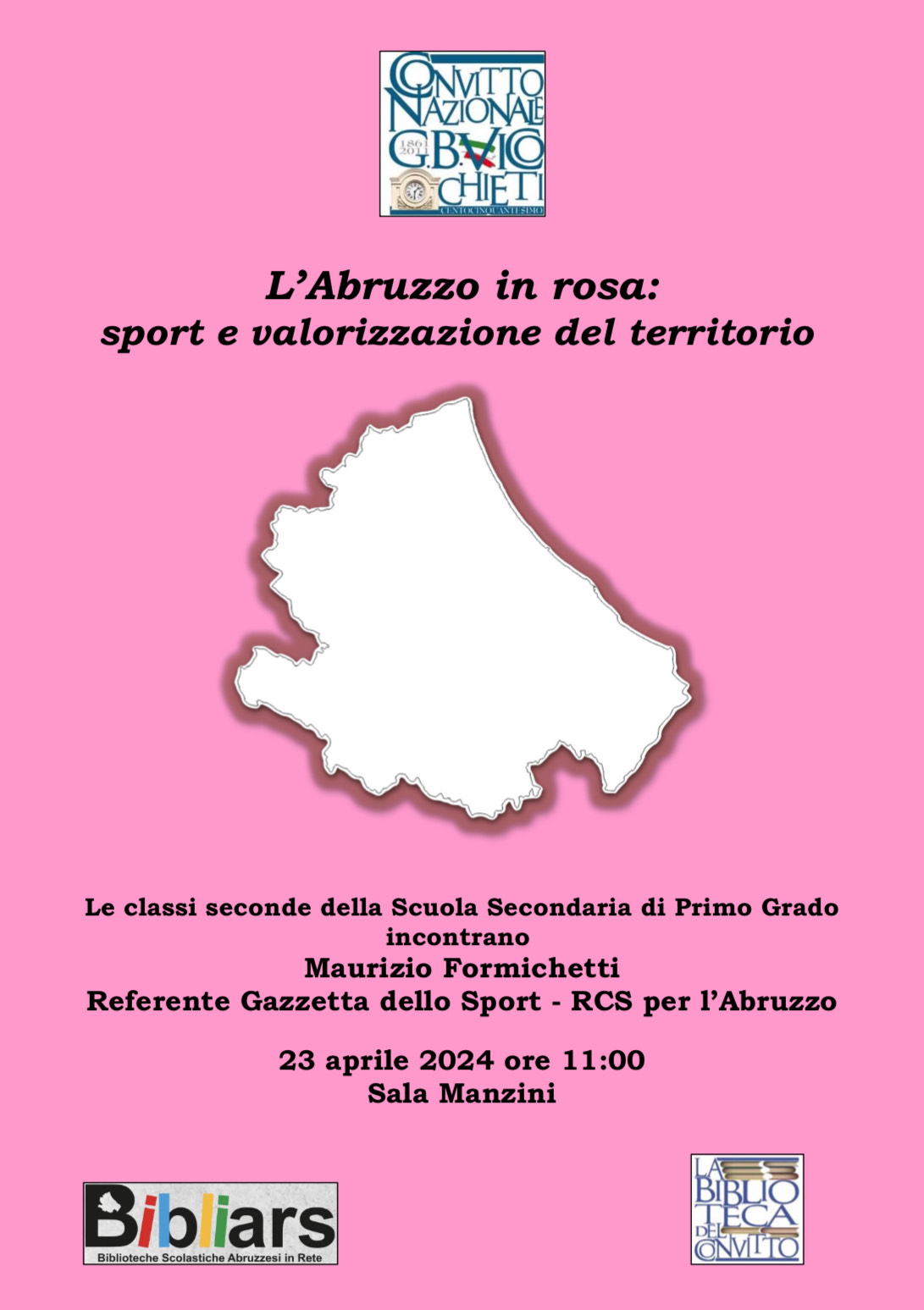 Le classi seconde della scuola secondaria di primo grado del Convitto Nazionale G.B. Vico di Chieti hanno incontrato, ieri mattina, Maurizio Formichetti, referente Gazzetta dello Sport – RCS per l’Abruzzo e Stefano Giuliani, dirigente sportivo ed ex ciclista professionista, vincitore di tappe al Giro d’Italia. I temi affrontati sono stati molteplici, dall’organizzazione delle tappe abruzzesi del Giro d’Italia a quali ricadute i valori dello sport possano avere nella vita. I ragazzi hanno partecipato con interesse e hanno rivolto agli ospiti innumerevoli domande.