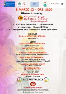 L’incontro, progettato, viene condotto dalla Dott.ssa Assunta Di Basilico, Presidente dell’Associazione “Donne Oltre – Benessere consapevole” e vede la presenza di importanti esponenti della politica locale: il Sindaco di Pineto Dott. Robert Verrocchio, che, dopo i saluti, parla della condizione oggi della donna nel mondo della politica. Sull’art.3 della Costituzione, segue l’Assessore Nicoletta Di Nisio, che espone le azioni messe in campo dal suo assessorato di pari opportunità nel Comune di Pescara. Come un calendoscopio magico, a questo punto, si aprono scenari nuovi di approfondimento sempre legati alla condizione della donna, ma che vanno dalle politiche alle emigrazione e cooperazione internazionali con la Dott.ssa Sandra Santavenere, alle problematiche di salute della donna in ambito ospedaliero, con il Dott. Roberto Antonacci, Responsabile del Reparto di Neurofisiopatologia all’Ospedale di Pescara.