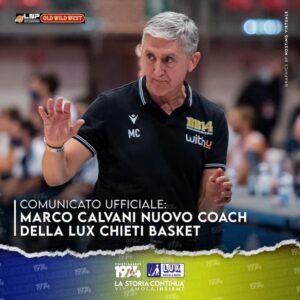 E’ un tecnico di esperienza Marco Calvani, nuovo coach della Lux Chieti, del quale il sodalizio teatino ha appena comunicato l’ingaggio Tecnico esperto e dal curriculum importante, coach Marco è ricordato dagli appassionati della palla a spicchi per le sue importanti esperienze tra Roma, Montecatini, Pesaro, Napoli e Sassari. Dopo l’esperienza sulla panchina di Bergamo (stagione 2020/2021), coach Calvani subentra a stagione in corso al tecnico Massimo Maffezzoli, a cui vanno i più sentiti ringraziamenti per quanto fatto in questi anni al timone della Lux. Lunedì 14 marzo alle ore 16:00 ci sarà la presentazione ufficiale del nuovo coach presso la sala stampa del Palatricalle.
