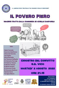 Prosegue la rassegna de “Il Giardino delle Pubbliche Letture … e non solo” e MARTEDI’ 2 AGOSTO alle ore 21.15 nell’incantevole Giardino Chiostrale del Convitto G.B. Vico, reso disponibile dalla storica istituzione scolastica diretta dalla prof.ssa Paola Di Renzo, ospita il reading “Il povero Piero” dalla commedia di Achille Campanile.