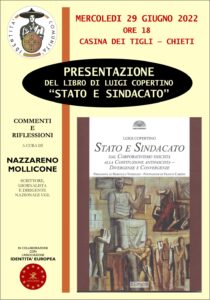 Mercoledì 29 giugno a Chieti, presso la “Casina dei Tigli” in piazza Mazzini 2, zona Villa Comunale, alle ore 18:00 verrà presentato il libro di Luigi Copertino “Stato e Sindacato”. Ne parleranno l’autore ed il giornalista Nazzareno Mollicone, studioso di storia politica e sindacale.