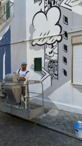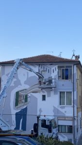 L’artista, pur avendo fatto i conti con il maltempo dei giorni scorsi, prosegue oggi in modo ostinato nella realizzazione di una “sorpresa artistica” per la Città sulla parete di un condominio di edilizia popolare: adesso pian piano l’opera prende forma tra lo stupore e la meraviglia di curiosi ed amanti dell’arte.