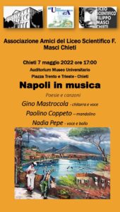 Dopo tre anni di assenza dovuti al persistere della pandemia, finalmente l’Associazione Amici del Liceo Scientifico F. Masci di Chieti, presieduta dalla vulcanica Professoressa Marta Albanese,  riporta a Chieti il trio Mastrocola-Coppeto – Pepe, che proporra’ musica e performance all’insegna della tradizione napoletana. L’evento si svolgerà sabato 07 Maggio, alle ore 17, presso l’Auditorium del Museo Universitario – Piazza Trento e Trieste – Chieti. L’ingresso è libero ed è consentito nel rispetto della normativa Covid in vigore.