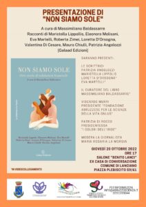E’ prevista per il 20 ottobre 2022 alle 17,00 presso il Salone Benito Lanci ex Casa di Conversazione comune di Lanciano (Ch), C.so Plebiscito 59/61 la presentazione di “Non siamo sole. Otto storie di solidarietà femminile”(Galaad Edizioni), libro a cura di Massimiliano Baldassarre.