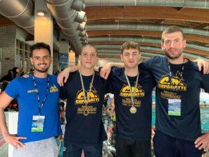 Le tre medaglie, due ori e un bronzo, sono arrivate da Lorenzo Fuschini che ha centrato una doppietta di ori nelle gare 100 metri rana con il tempo di 1’02″99 e nei 200 metri rana con il tempo di 2’17″67 e da Lorenzo Candeloro, bronzo nei 50 dorso con il tempo di 25″40.
