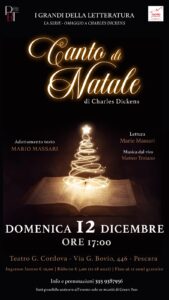 Oggi 12 Dicembre alle ore 17 al teatro G. Cordova di Pescara andrà in scena “ll canto di Natale” di Charles Dickens, letto e narrato da Mario Massari con la musica dal vivo di Matteo Troiano. A distanza di 24 ore dal grande successo di “Non ti conosco più amore”, il regista Mario Massari presenta un grande classico di Natale. La storia narra delle vicende fantastiche di Scrooge, un uomo d’affari della City, cattivo ed egoista, burbero e taccagno, ingrato alla vita e che, in quanto tale, si rifiuta di celebrare il Natale pensando che tale giorno sia come tutti gli altri, anzi, peggiore perché non conclude affari e perde solo tempo. Saranno le apparizioni dello spirito del suo vecchio socio in affari Jacob Marley, del Natale passato, Presente e Futuro a fargli cambiare idea.