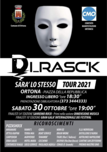 Sabato 30 Ottobre 2021, con inizio alle ore 19.00 e ingresso libero a partire dalle 18.30 (prenotazione obbligatoria telefonando al 3733444333), si terrà ad Ortona in Piazza della Repubblica il concerto della band rock ortonese dei Dirasc’k, formata dai musicisti: Alberto Arpa (Voce e Chitarra), Silvio Marrone (Chitarra, Basso, Piano, Sintetizzatori, Programmazioni), Cristiano Lo Medico (Basso e Programmazioni), Alessio Palizzi (Batteria), Riccardo Grumelli (Chitarra, Basso, Controbasso, Voce e Cori), Giovanni Barbone (Tecnico del Suono e Assistente di Palco).
