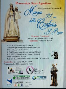 Si terranno questo fine settimana nel quartiere di Santa Maria di Chieti i festeggiamenti in onore della Madonna della Cintura e di San Rocco. Il programma prevede sabato sera il concerto dei Black cat, cover di Zucchero, alle 21,30 con l’apertura un’ora prima degli stand gastronomici. Il rito religioso avrà luogo domenica con la processione e la celebrazione della messa nella Chiesa di Sant’Agostino.