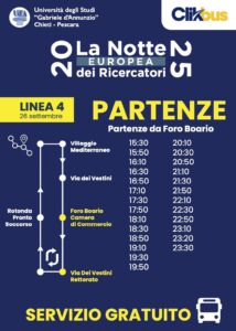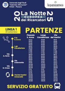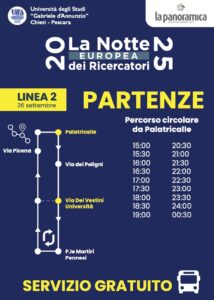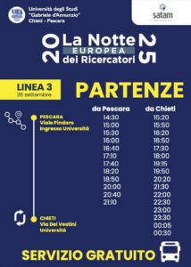 Sarà facile, comodo e gratuito partecipare all’edizione 2025 de “La Notte Europea dei Ricercatori”, in programma domani, 26 settembre, dalle 16,00 in poi, presso il Campus di Chieti dell’Università “Gabriele d’Annunzio”. Il Gruppo di lavoro che organizza la grande manifestazione, coordinato dalla professoressa Elisabetta Dimauro, ha predisposto anche quest’anno un efficace servizio di bus-navetta gratuito Ci saranno 4 linee di bus-navetta. La “Linea 1”, grazie alla consolidata collaborazione con “La Panoramica”, collegherà la Città alta con il Campus universitario, dal capolinea di Sant’Anna, con fermate a Largo Cavallerizza (San Giustino), Grande Albergo Abruzzo e Stazione di Chieti Scalo, per arrivare a via dei Vestini, all’ingesso del Rettorato (prima partenza alle 15:00). La “Linea 2”, anch’essa gestita da “La Panoramica” (prima partenza alle 15:00), collegherà il parcheggio del Pala Tricalle, in via Picena, gentilmente concesso dal Comune di Chieti, al Campus universitario, con fermata a Piazzale Martiri Pennesi. La “Linea 3” collegherà direttamente il Campus di Pescara in viale Pindaro al Campus di Chieti con pullman della SATAM (prima corsa alle 14,30). La “Linea 4”, infine, allestita gratuitamente grazie alla collaborazione con Clikbus della “Di Fonzo”, collegherà il parcheggio del Foro Boario a Chieti Scalo, gentilmente concesso dalla Camera di Commercio di Chieti e Pescara, al capolinea del Rettorato, con fermata al parcheggio del Villaggio Mediterraneo (prima partenza alle 15:30 ultima alle 23:30). Il servizio si concluderà con l’ultima corsa delle Linee 1, 2 e 3, quella delle 00,30, così da consentire, soprattutto ai più giovani, di poter assistere alla serata musicale e rientrare in sicurezza a casa.