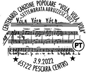 In occasione delle celebrazioni per il centenario della canzone popolare “Vola, vola, vola”, sabato 3 settembre, su richiesta dell’associazione “Settembrata Abruzzese”, Poste Italiane attiverà due servizi postali temporanei con bollo speciale a Pescara. Presso le postazioni, allestite all’Aurum dalle 10 alle 13 e in largo Madonna dei Sette Dolori dalle 19 alle 23, sarà possibile timbrare con l’annullo speciale tutte le corrispondenze presentate. Il bozzetto dell’annullo riproduce il primo rigo della partitura estratta dal manoscritto originale. Completano l’annullo le scritte “Centenario canzone popolare “Vola, vola, vola” – Settembrata abruzzese 2022» e «3.9.2022 – 65122 Pescara Centro”.