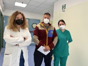 Primo paziente, nella foto insieme alle due dottoresse in servizio nell’unità operativa, per l’Endoscopia di Atessa, reparto completamente rinnovato grazie a fondi pubblici e privati che la Asl Lanciano Vasto Chieti ha destinato all’ospedale. Parte dell’investimento complessivo di tre milioni di euro fatto sul “San Camillo de Lellis” ha riguardato lavori di adeguamento strutturale della Medicina Covid, Pronto soccorso, Radiologia, Riabilitazione ed Endoscopia, il resto della cifra ha consentito l’ammodernamento del parco tecnologico. L’Endoscopia, di cui è responsabile Maria Marino, è attiva per quattro giorni a settimana (lunedì, mercoledì, giovedì e venerdì) ed è in grado di gestire 12 pazienti al giorno. Le prestazioni disponibili sono gastroscopie, colonscopie con sedazione e visite. “Il martedì – spiega la dottoressa Marino – l’équipe si trasferisce nella sala operatoria dell’ospedale di Lanciano per l’endoscopia operativa delle vie biliari”.