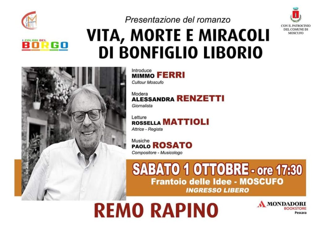 L’appuntamento è per sabato 1 ottobre alle ore 17.30, ed è possibile grazie al Patrocinio del Comune di Moscufo e alla collaborazione della Mondadori Bookstore di Pescara; introduce l’evento il presidente dell’associazione, Mimmo Ferri, che dichiara: “Siamo orgogliosi di ospitare l’autore abruzzese in area vestina che sicuramente richiamerà l’attenzione di tanti amanti della letteratura locale e nazionale. Un vero e proprio cult della narrativa italiana contemporanea, se ne è parlato tanto e non potevamo perdere l’occasione di invitarlo nella nostra terra”.