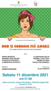 Sabato 11 Dicembre 2021 alle ore 21:00 presso il Teatro comunale di Città S. Angelo andrà in scena “Non ti conosco più amore”, una commedia brillante in due atti di Aldo De Benedetti con la regia di Mario Massari. La storia parla di Luisa, bisbetica moglie dell’avvocato Paolo Malpieri, che un giorno dopo una crisi di nervi non lo riconosce più. Il marito chiede aiuto al professor Spinelli e la moglie riconosce in lui il marito. Arriva una zia di Luisa che non conosce il marito e tenta di accasare la figlia Evelina all’avvocato presentato come amico di famiglia da Luisa. Il mattino seguente il dottore, parlando con la dattilografa, scopre che la crisi è avvenuta quando la moglie ha visto l’avvocato mentre baciava la ragazza. I due alla fine si riconciliano, mentre Alberto, che in seguito alla lunga frequentazione aveva cominciato a innamorarsi della donna, rimane solo e sconsolato.