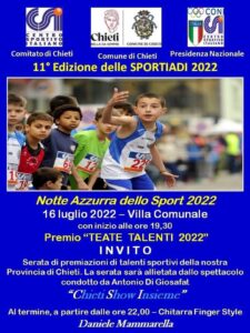 Sabato 16 Luglio alla Villa Comunale di Chieti con inizio alle ore 20 è in programma la Notte azzurra dello sport 2022. Una serata di premiazioni di talenti sportivi della Provincia di Chieti che sarà allietata dallo spettacolo condotto da Antonio Di Giosafat “Chieti Show Insieme” e dalle ore 22,00 da Chitarra Finger Style con Daniele Mammarella.