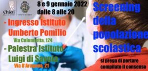 Domani, sabato 8 e domenica 9 gennaio 2022, dalle ore 8 alle ore 20 (orario continuato) verranno eseguiti gli screening con tampone antigenico dedicati agli alunni, studenti e personale scolastico dei Comprensivi e Istituti scolastici cittadini e non. Si ricorda che si tratta di un’iniziativa rivolta a ragazzi e personale delle scuole primarie e secondarie presenti in città, a partire dalle scuole elementari, poi medie e superiori, resa possibile dalla sinergia fra Regione Asl e Comuni con la Struttura Commissariale del generale Figliuolo per le attività di testing anti Covid negli istituti scolastici, portate avanti dal personale medico dell’Arma dei Carabinieri e dell’Esercito.