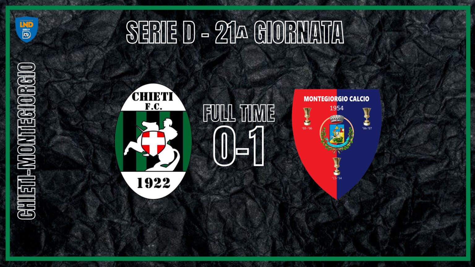 Battuta d’arresto inaspettata per il Chieti che quest’anno sembra proprio non riuscire ad avere continuità di risultati. Vince il Montegiorgio per 1 a 0, dopo una partita dove il Chieti non è riuscito a concretizzare delle palle goal, che, avrebbero potuto indirizzare la gara verso un risultato diverso. Prima del goal vittoria degli ospiti, infatti, i neroverdi hanno sfiorato il vantaggio con Cesario al 6′ del primo tempo e con Spinelli che al 42′ impegna il portiere avversario Forconesi con un pericoloso colpo di testa. Il goal vittoria dei marchigiani arriva con Diop al 11′ minuto della ripresa. Delusione e rammarico per il pubblico teatino che seppur infreddolito dal clima gelido di quest’oggi all’Angelini, non ha mai smesso di incitare la squadra.