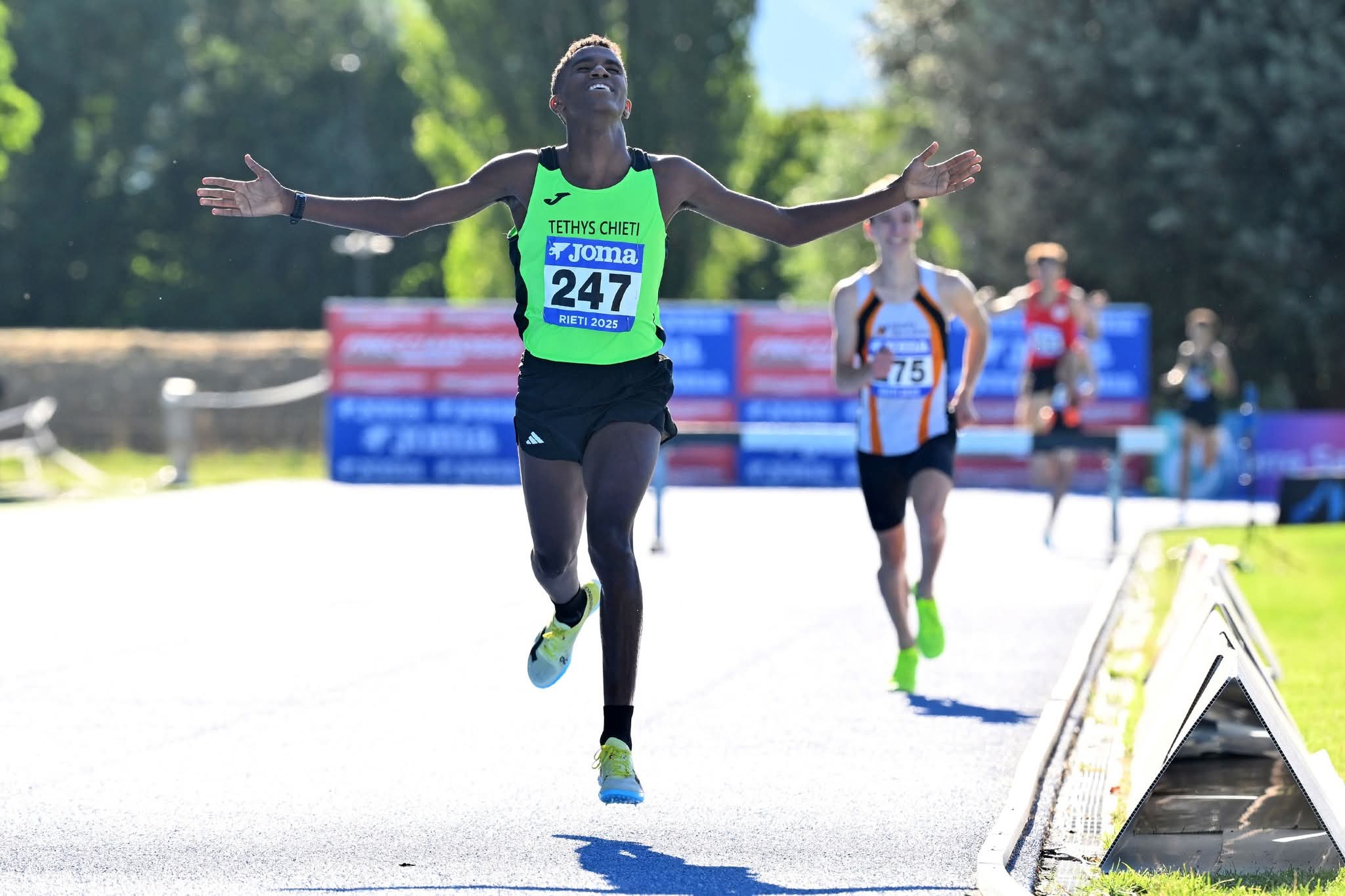 Subito un risultato strepitoso nei campionati italiani Allievi di atletica leggera per la Tethys Chieti (oggi e domani a Rieti stadio Guidobaldi). Il bravissimo Tamirat Del Prete su e’ laureato campione italiano dei 2000 siepi con il tempo di 5’45.74 a soli 10 centesimi dal record italiano. Tamirat ha preceduto due atleti trentini: 2° e’ giunto Alessio Zandonella 5’58.40 (Valle di Cembra, Trento), 3° Nicholas Odorizzi 5’54.68 (Quercia Dao Rovereto).