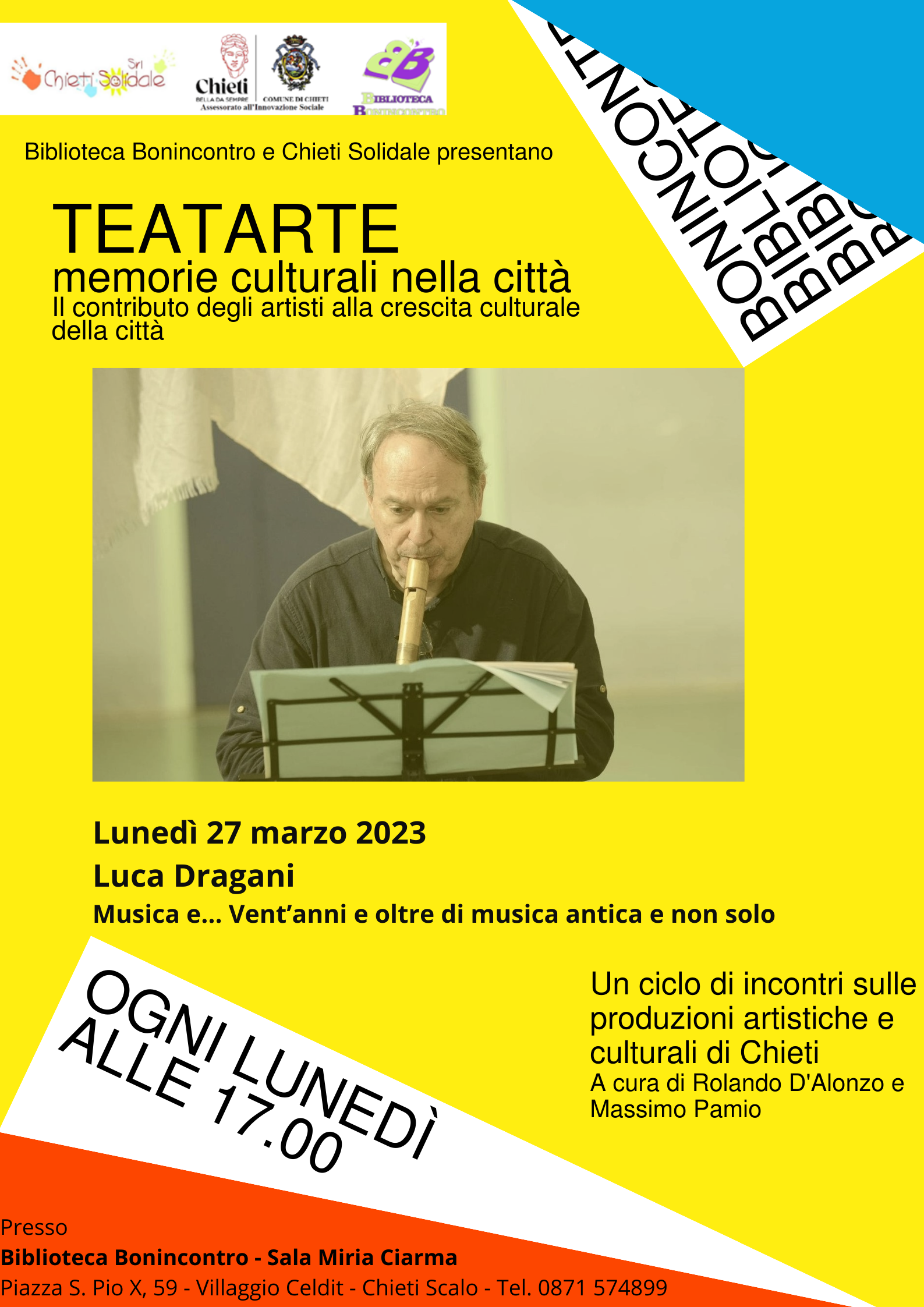 Lunedì 27 marzo, alle ore 17, presso gli spazi della Biblioteca Bonincontro del Villaggio Celdit – piazza San Pio X, Chieti Scalo, per il ciclo “Teatarte. Memorie culturali nella città”, curato da Rolando D’Alonzo e Massimo Pamio, Luca Dragani terrà l’incontro “Musica e… Vent’anni e oltre di musica antica e non solo”. Il musicista racconterà la sua esperienza a Chieti e illustrerà le rassegne che ha curato. Luca Dragani è medico ospedaliero ma si interessa alla musica antica da più di quarant’anni. Ha iniziato lo studio del flauto dolce con Ubaldo Di Gregorio, dedicandosi successivamente allo studio degli antichi strumenti a fiato del Rinascimento e perfezionandosi in Master Class tenute da importanti musicisti internazionali. Ha inoltre studiato Oboe e Oboe barocco, ha seguito corsi di Viola da gamba e di Flauto dolce, ha approfondito lo studio della musica vocale.