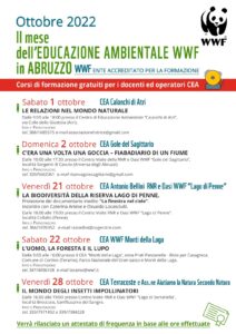 Si ripete anche quest’anno l’appuntamento del WWF Abruzzo con l’educazione ambientale: il consueto corso per insegnanti e operatori sarà organizzato sempre in modo itinerante tra i Centri di Educazione Ambientale (CEA) WWF e le Oasi WWF presenti nel territorio regionale durante tutto il mese di ottobre.