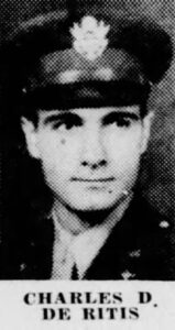 Charles si diplomò alla “Allendale School”, alla” Hill Preparatory School” di Pottstown in Pennsylvania e alla “Wharton School of Finance of the University of Pennsylvania”. Si arruolò nell’ottobre 1942 ed fu inviato oltreoceano, nel gennaio 1944, come capo pilota su un bombardiere “Martin B-26 Marauder” (detto “Predone”)  del “394th Bomber Group”, “Medium”, “586th Bomber Squadron”. Il Capitano Charles J.De Ritis incontrò la morte il 18 novembre 1944, durante la sua 61° missione sulla Germania (con lui rimase ucciso l’intero equipaggio di nove uomini). A Charles J. De Ritis furono concessi i seguenti riconoscimenti: “Distinguished Flying Cross”; “Air Medal”; “Purple Heart”; “United States Aviator Badge Army”; “World War II Victory Medal”; “American Campaign Medal”; “Army Presidential Unit Citation”; “Army Good Conduct Medal” e “European-African-Middle Eastern Campaign”.