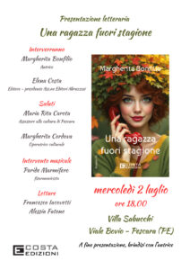 Mercoledì 2 luglio alle ore 18 presso Villa Sabucchi, in viale Bovio, ci sarà la presentazione del romanzo “Una ragazza fuori stagione” della poetessa e scrittrice Margherita Bonfilio. Parteciperanno l’editore Elena Costa, l’assessore alla cultura Maria Rita Carota, la promotrice culturale Margherita Cordova, il fisarmonicista Paride Marmifero.
