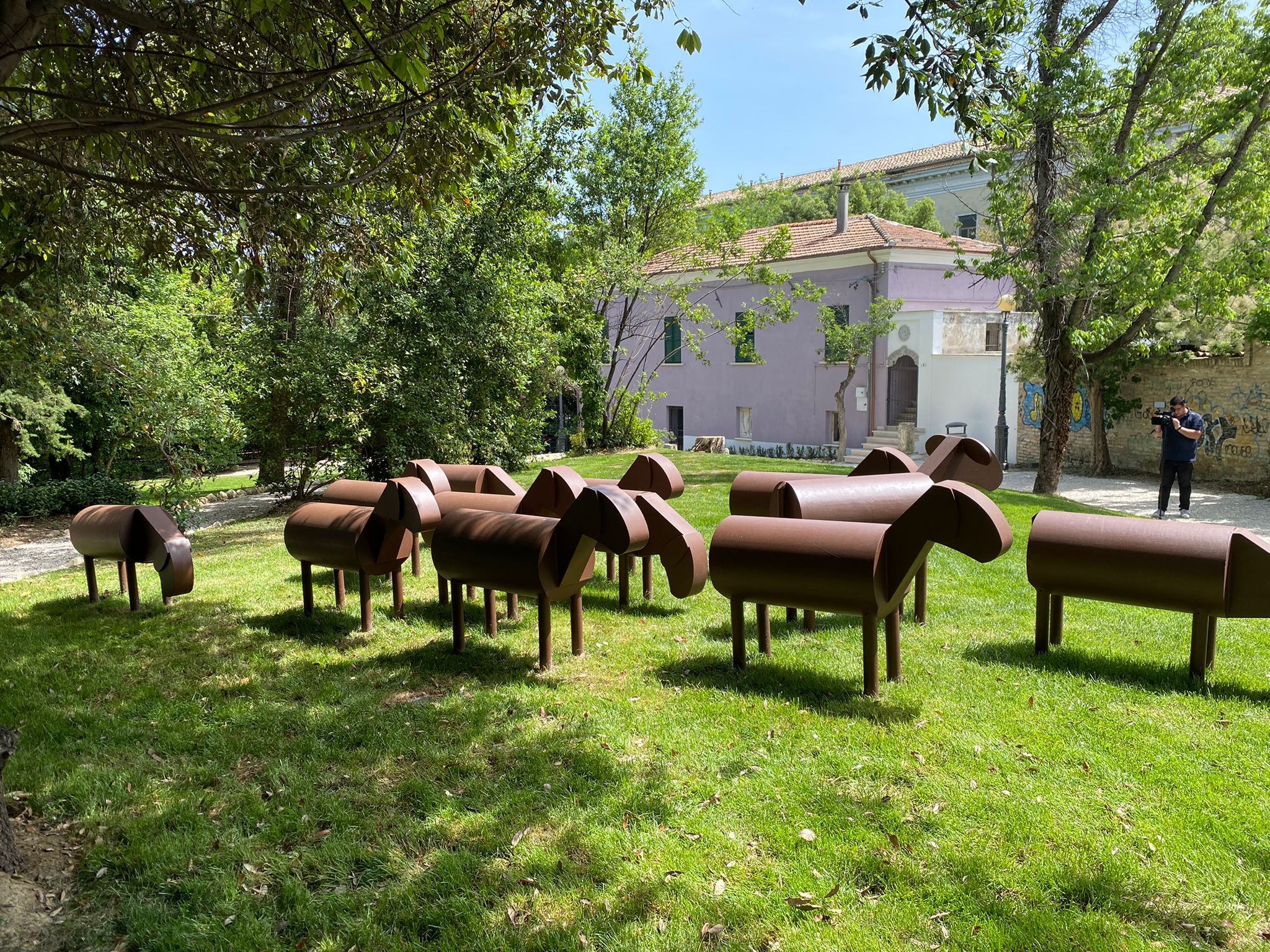 “L’intervento ha interessato una porzione della Villa Comunale prima inaccessibile e utilizzata come deposito comunale – così l’architetto Dario Di Luzio che ha curato la progettazione – L’open ha eliminato ogni barriera, recinzione ed ostacolo realizzando un ampio prato aperto.È stato eseguito un restauro della copertura e delle facciate dell’edificio della ex casa del custode, il casinetto Frigerj, creando una continuità funzionale con l’area in prospettiva di un suo utilizzo e gestione per attività di incontro ed intrattenimento.L’installazione collocata alla sommità del prato, denominata Peqere, è una scultura “vivibile”, sui temi della pastorizia e della transumanza, caratteristici della tradizione e della storia del nostro territorio. Volumi geometrici essenziali assemblati per dar vita ad un simbolico gregge composto da dodici pecore, ognuna delle quali rivolta nella medesima direzionale, in posizione eretta o in posizione di brucare l’erba. Una sola di esse sembra essersi accorta dalla presenza del mondo circostante ed ergendosi con attenzione e curiosità, incrocia lo sguardo del viandante.Un’installazione che, eludendo falsi miti e leggendarie storie di epici eroi, ci narra, senza pregiudizi e con sottile ironia, un aspetto fondamentale dell’origine della nostra cultura e del “disegno” del nostro territorio. Nella sua chiave contemporanea esse\ non vuole rappresentare ma evocare, non vuole piacere ma stimolare, non vuole celebrare ma raccontare e, come tale, non va contemplata ma vissuta.È stato inoltre restaurato e consolidato il ponticello storico che attraversa via Costanzi.L’Amministrazione comunale mette quindi a disposizione questo luogo esclusivo per rilassarsi sul prato, giocare sull’erba, prendere il sole magari gustando un panino confidando nell’educazione ed il rispetto dei cittadini”.