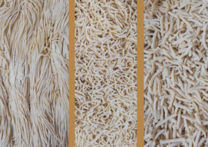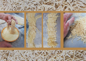 La prima volta che nonna Maria fece la pasta all’uovo era così piccolina che per arrivare al piano di lavoro si aiutò con una sedia: “Brava Maria!” –  disse la madre rientrando dal lavoro nei campi – “ È un po’ troppo dura!” – aggiunse. La cuoca in erba non si demoralizza. Piuttosto, in pochissimo tempo impara che per fare una buona pasta all’uovo occorre rispettare la proporzione tra cento grammi di farina ed un uovo intero e con il tempo l’esperienza le è servita ad affinare l’occhio e capire dalla massa che poco a poco prende forma, se e quando aggiungere altra farina.